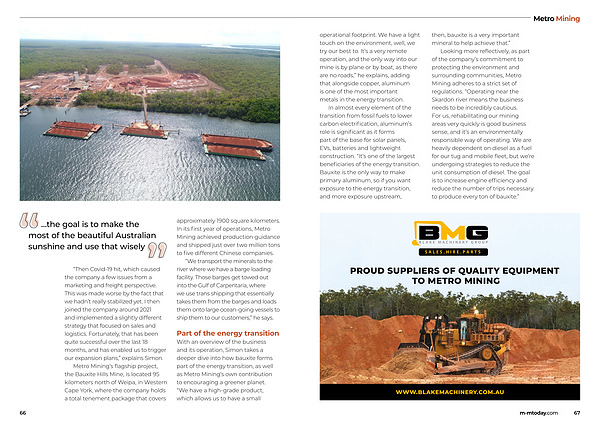 Metro Mining operational footprint . We have a light touch on the environment , well , we try our best to . It ’ s a very remote operation , and the only way into our mine is by plane or by boat , as there are no roads ,” he explains , adding that alongside copper , aluminum is one of the most important metals in the energy transition .