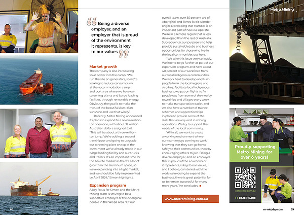 Metro Mining overall team , over 35 percent are of Aboriginal and Torres Strait Islander origin . Developing that number is an important part of how we operate . We ’ re in a remote region that is less developed than the rest of Australia . Subsequently , our purpose is to help provide sustainable jobs and business opportunities for those who live in the local communities out here .