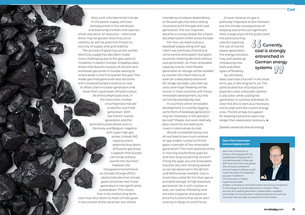 For now , we need coal as a baseload supply along with gas . I don ’ t see Germany , Poland and some central and eastern European countries meeting demand without coal generation . As more renewable capacity is built , more flexible generation or storage will be needed to counter the intermittency of solar ( on a daily basis ) and wind ( for longer periods ). Low start-up costs and major flexibility will be crucial in most countries with heavy renewable development , but this will not be provided by coal .