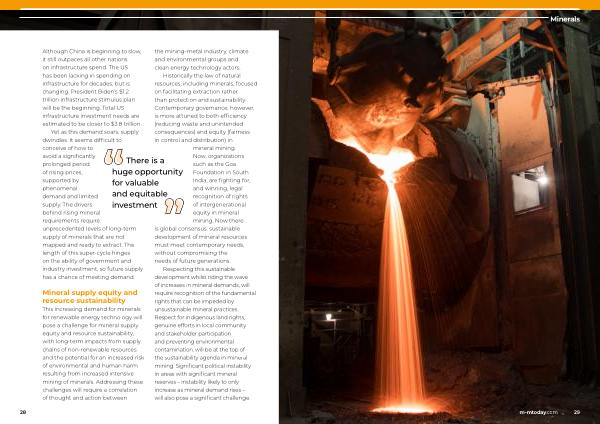 Respecting this sustainable development whilst riding the wave of increases in mineral demands , will require recognition of the fundamental rights that can be impeded by unsustainable mineral practices . Respect for indigenous land rights , genuine efforts in local community and stakeholder participation and preventing environmental contamination , will be at the top of the sustainability agenda in mineral mining . Significant political instability in areas with significant mineral reserves – instability likely to only increase as mineral demand rises – will also pose a significant challenge .