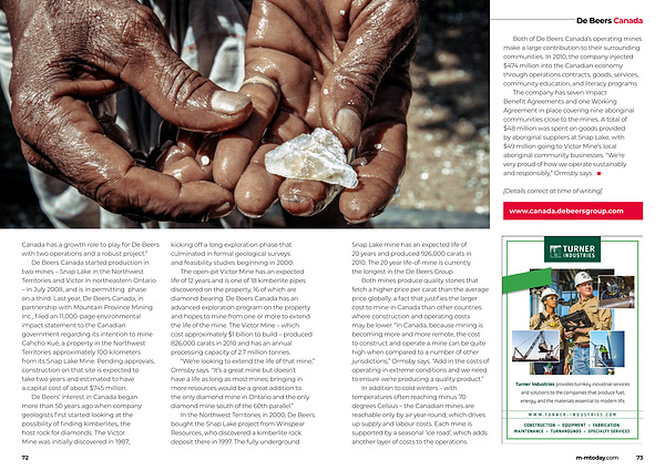 De Beers Canada started production in two mines – Snap Lake in the Northwest Territories and Victor in northeastern Ontario – in July 2008 , and is in permitting phase on a third . Last year , De Beers Canada , in partnership with Mountain Province Mining Inc ., filed an 11,000-page environmental impact statement to the Canadian government regarding its intention to mine Gahcho Kué , a property in the Northwest Territories approximately 100 kilometers from its Snap Lake Mine . Pending approvals , construction on that site is expected to take two years and estimated to have a capital cost of about $ 745 million .